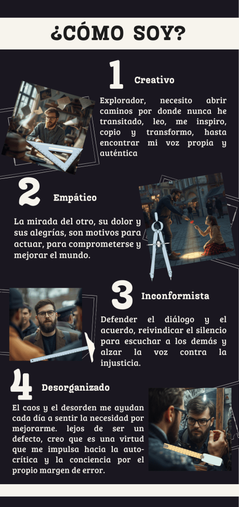 Creo que por debajo de todo buen profesional necesariamente ha de haber una buena persona. Pero no sólo una buena persona. Es necesario, creo, el compromiso por el mantenimiento de la calidad y de la mejora del sector en el que esa persona desarrolla su carrera profesional, en este caso la educación. Es necesario, en este sentido, ser conocedor de la parte técnica pedagógica con la que diseñar un Proyecto Educativo eficiente e interesante, pero también conocer, valorar y hacer cumplir no sólo la legislación sino también los principios morales del espíritu que la inspira. Ahora te pido que eches un vistazo a la siguiente infografía en la que he elegido cuatro adjetivos que creo mejor me definen.